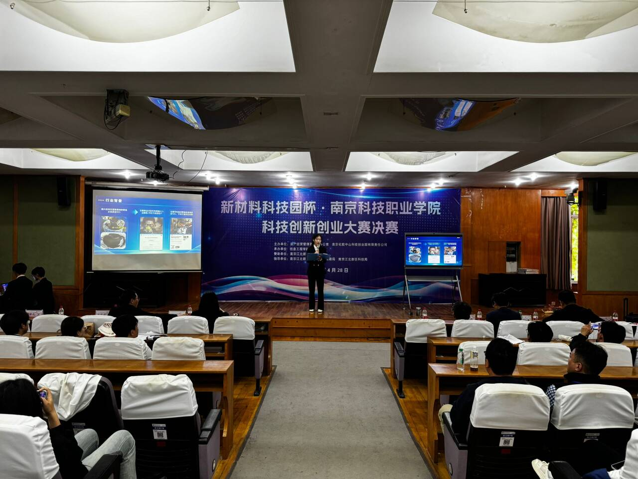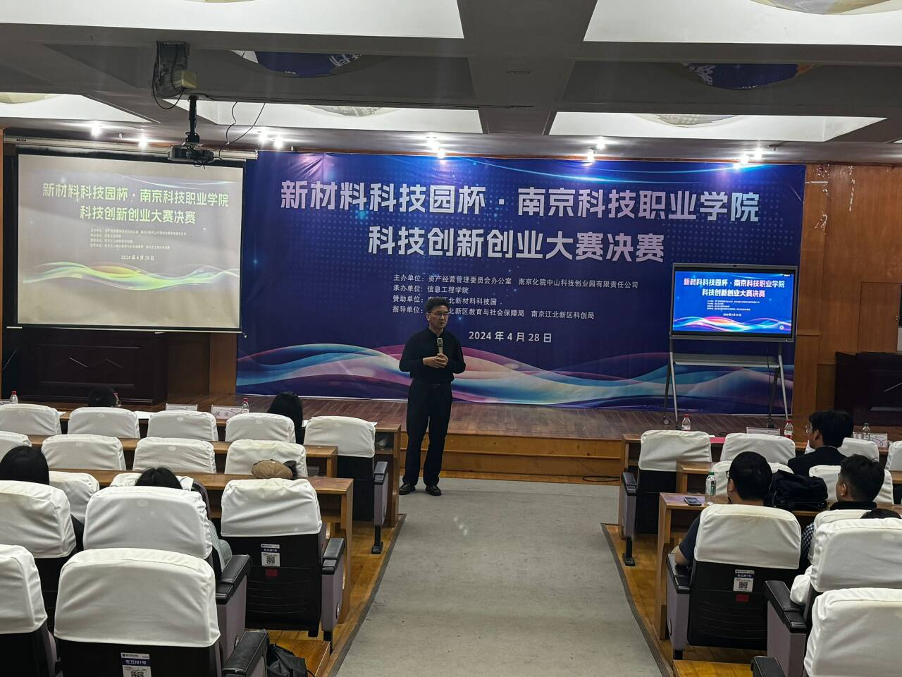 在南京江北新区教育与社会保障局、科创局、校党委行政的正确领导下,在南京江北新材料科技园、智能制造产业园等园区支持下,为进一步激发我校大学生的创新创业热情,科创园举办2024“研产贯通-科教融汇“科技创新创业大赛,学校相关职能部门、各学院通力合作,精心组织项目报名参赛,经初选、复赛、决赛等一系列赛事流程,决赛于4月28日下午在竞先楼辅楼报告厅举行,学院副校长杨青莅临大赛现场并致辞,校内外专家和参赛学生100余人出席竞赛。